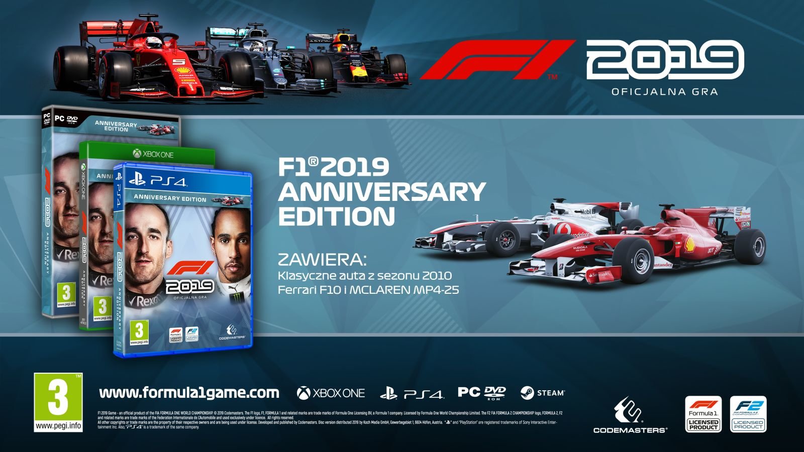 Aby odpowiednio uczcić 10 lat obecności marki F1 na rynku, studio Codemasters przygotowało dla największych fanów specjalną edycję F1 2019 Anniversary Edition z dodatkową zawartością, czyli dwoma zwycięskimi bolidami z klasycznego sezonu 2010: Ferrari F10, prowadzonego przez Fernando Alonso i Felipe Massę oraz McLarenem MP4-25 Lewisa Hamiltona i Jensona Buttona. Obie maszyny dołączą do dostępnych już klasycznych bolidów Red Bulla RB6 Sebastiana Vettela i Marka Webbera z 2010 r. oraz innych klasycznych maszyn z biblioteki F1 2018 r.
