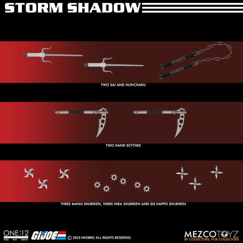 The One:12 Collective Storm Shadow is outfitted in a short-sleeved karategi with Cobra insignia, shin guards, and tabi boots. His chest harness can hold 3 kunai in the front and his quiver in the back, and his thigh sheath can hold his nunchaku. Storm Shadow comes complete with two masked head portraits with different facial expressions, and 1 unmasked portrait.