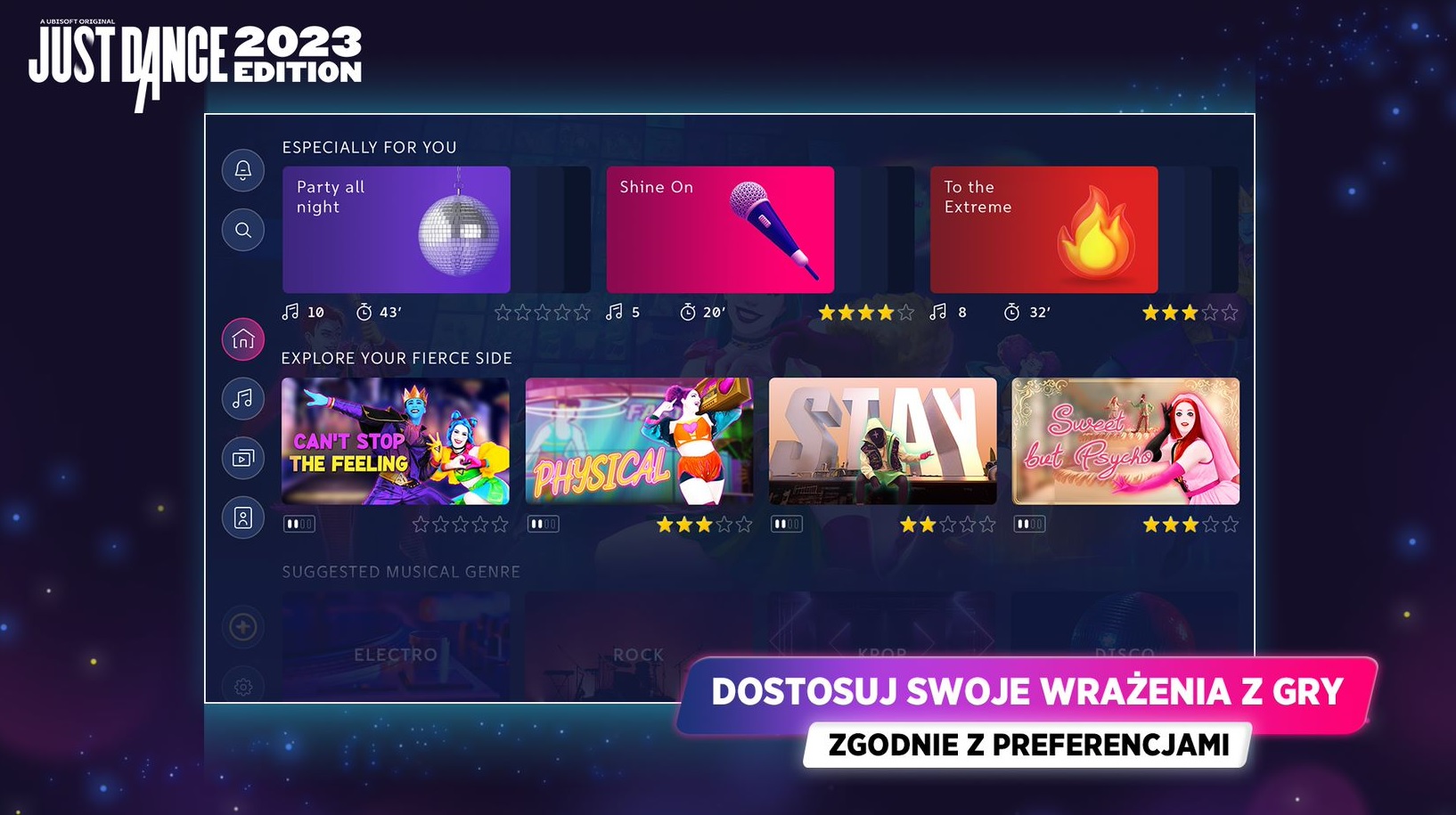 Odblokuj niestandardowe sesje i utwory dostosowane do Twoich preferencji. Just Dance będzie śledzić i zapisywać Twoje postępy, więc możesz pochwalić się swoimi tanecznymi umiejętnościami przed całym światem! Just Dance 2023 to Twoja platforma tańca! *Dodatkowa zawartość będzie udostępniana w ciągu 12 miesięcy od premiery gry. Wymagane jest pobranie i szybkie połączenie internetowe.